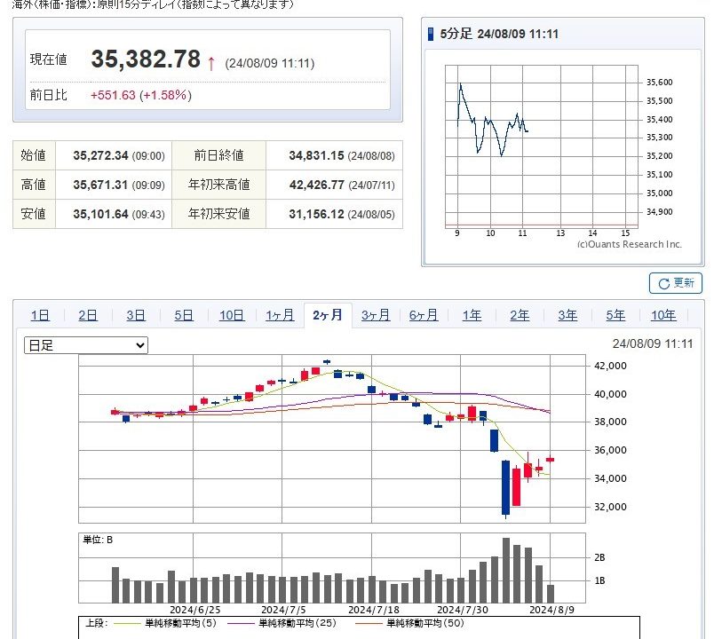 さらにその翌日(2024/8/7)も終値で967.27円あげて、本日35.025.00円(+193.85円)で終わりました。